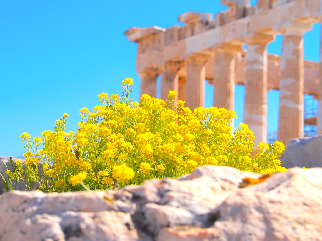 アテネで偶然撮れた良さげな写真。 青い空、黄色い花、白い遺跡。立体感。 素人目で恐縮だけど、なかなか悪くないのでは!