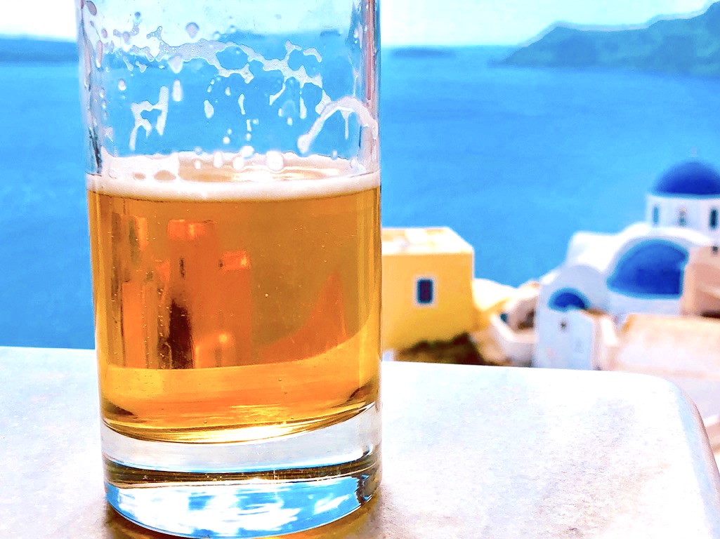 強い日差しが、エーゲ海や白い建物に反射して、顔に当たる。 歩いていると汗をかく。 日陰でランチがてら休憩しよう。 お店に入って、ビールをぐいっと飲む。