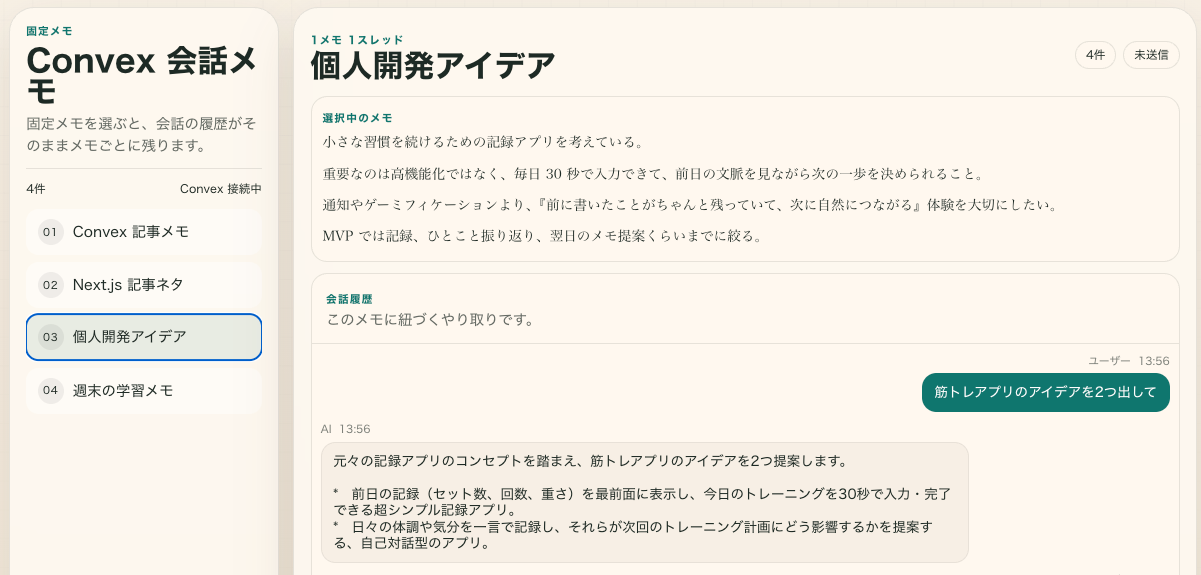 今回は、会話が続いていく最小単位のアプリ として Convex がどう見えるかを確かめたかったので、メモの作成や編集、RAG、複数スレッドの切り替えのようなものは入れていません。