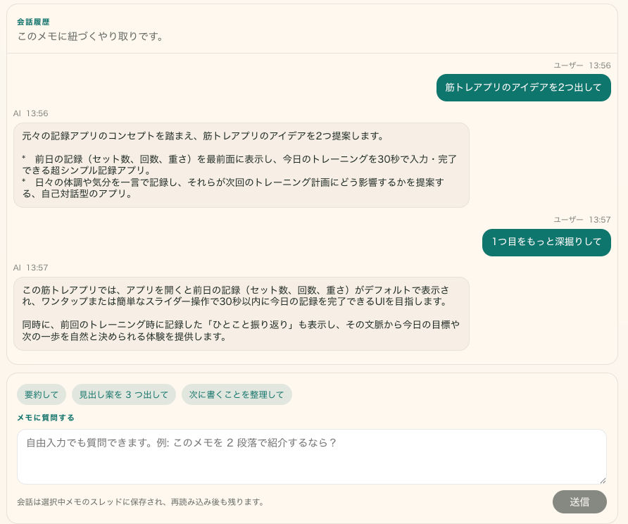 - AI には、メモ本文とその thread の履歴を前提として渡す