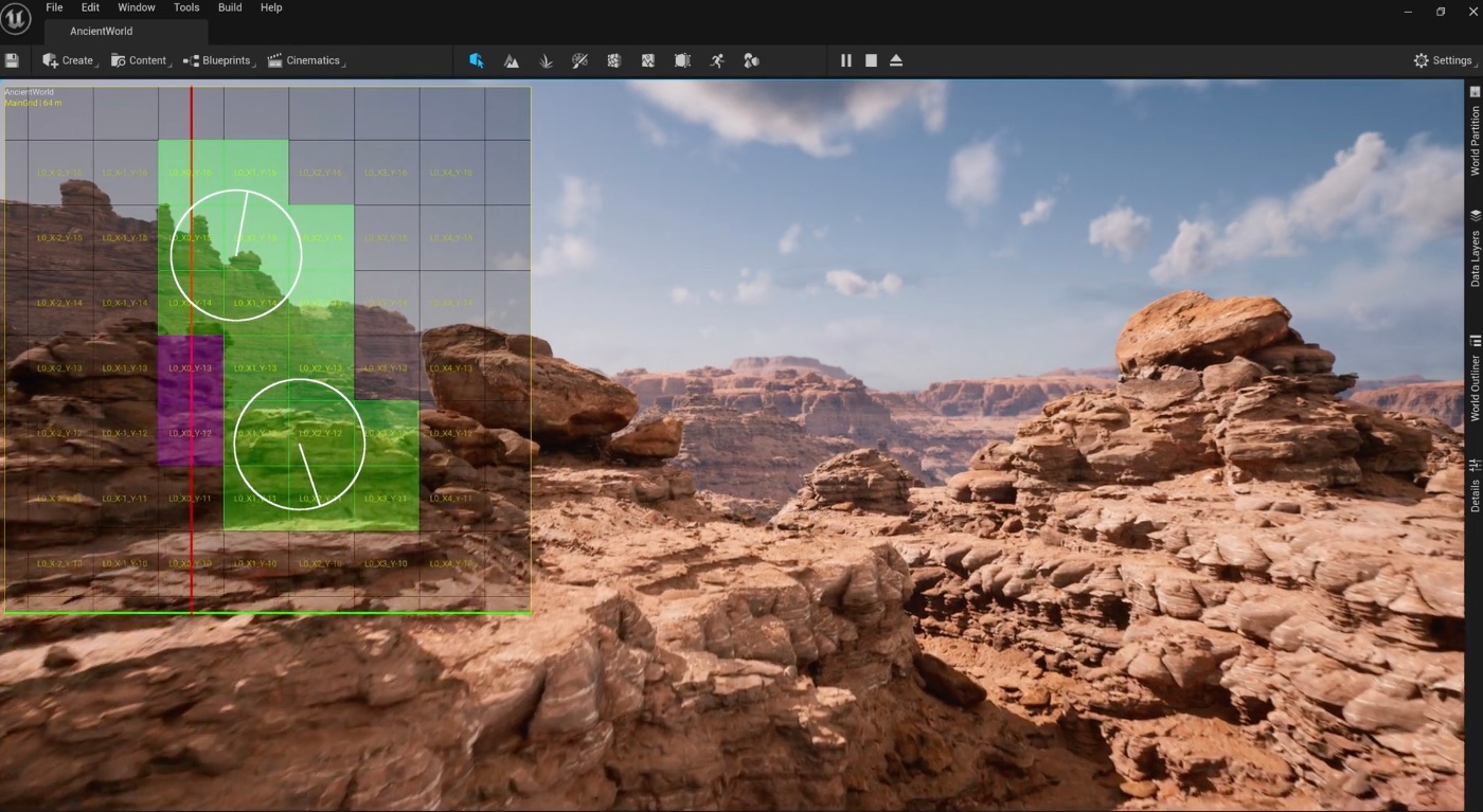 オープンワールドの作成を高速かつ簡単に作成できるよう目指して作られたのがWorld(ワールド) Partition(敷居) システムです。World Partition システムはワールドを自動でグリッドで分割しセル毎に自動でロード、アンロードなどできるようになります。