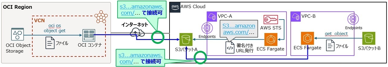 | 1 | ファイル連携 | 署名付きURL | IAM認証がなくても S3 に一定期間アクセスが有効なURL | 利用可(バケット非公開で) |