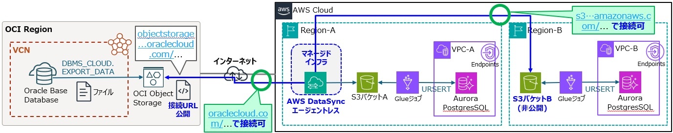 - エージェントレス方式:AWSの管理ネットワークから、インターネット経由で転送先の公開エンドポイントへ接続