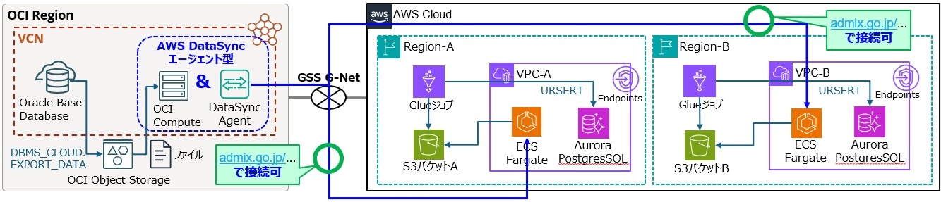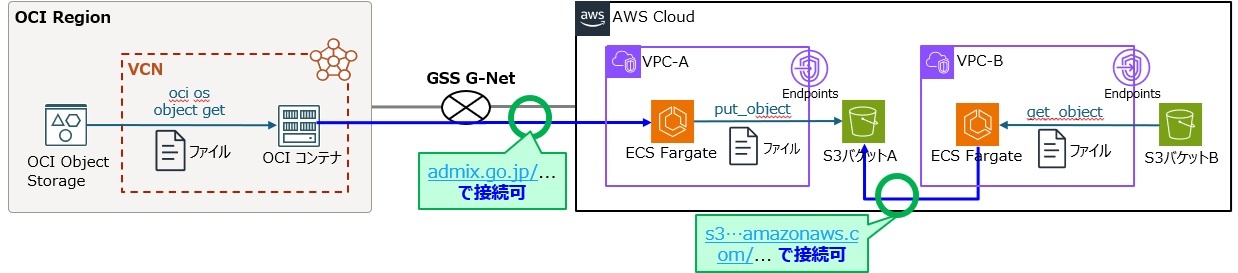 私が担当したプロジェクトでは、Oracle Cloud Infrastructure(OCI)× GSS G-Net × AWS を取り扱っていたため、そのシチュエーションをもとに、私の得意領域である AWS 視点で OCI との間のファイル連携とデータ同期を整理しています。