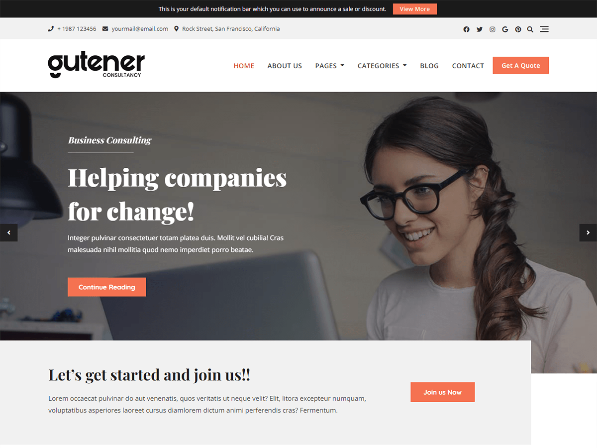 Gutener Consultancy is clean, creative, powerful, flexible, highly customizable and Gutenberg ready WordPress theme. It is fully responsive and is sure to make your website stand out from the crowd. Gutener Consultancy is a multipurpose theme suitable for any type of WordPress sites such as business, law firms, personal blog, portfolio, startups, agencies, travel, education, fitness, medical, sports, fashion, shop, WooCommerce stores, magazines, lifestyle, finance, accounting, consulting, and preferably ideal for any type of sites. Gutener Consultancy is highly customizable with powerful theme options including multiple Header and Footer layouts. Compatibility for WordPress Classic editor, WooCommerce and Gutenburg makes easier for users. Want a theme to play your site in a myriad of roles your search ends here. Browse the demos to see that its the only theme you will ever want: https://demo.keonthemes.com/gutener