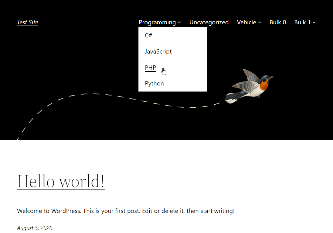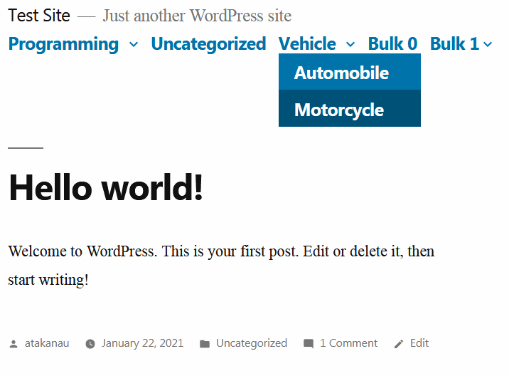 - Type your shortcode with parameters, e.g. [autocategorymenu hide_empty=”0″]