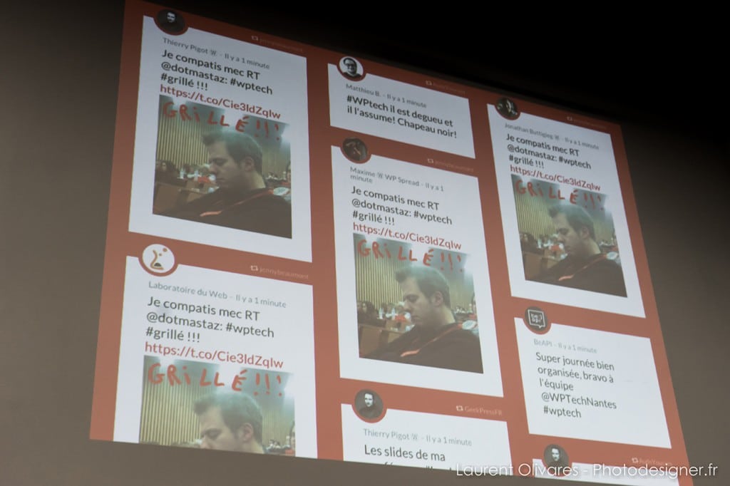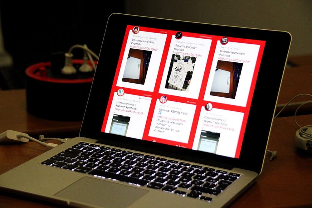 This plugin was originally designed to display attendees’s tweets during the WP Tech Nantes, and WordCamp Paris events.