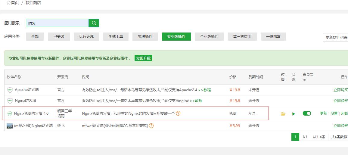 3、登陆成功就可以去安装免费的防火墙了,你也可以直接在软件商店中搜索防火墙就可以了,目前貌似只有nginx的免费防火墙,你如果是apache无法使用。