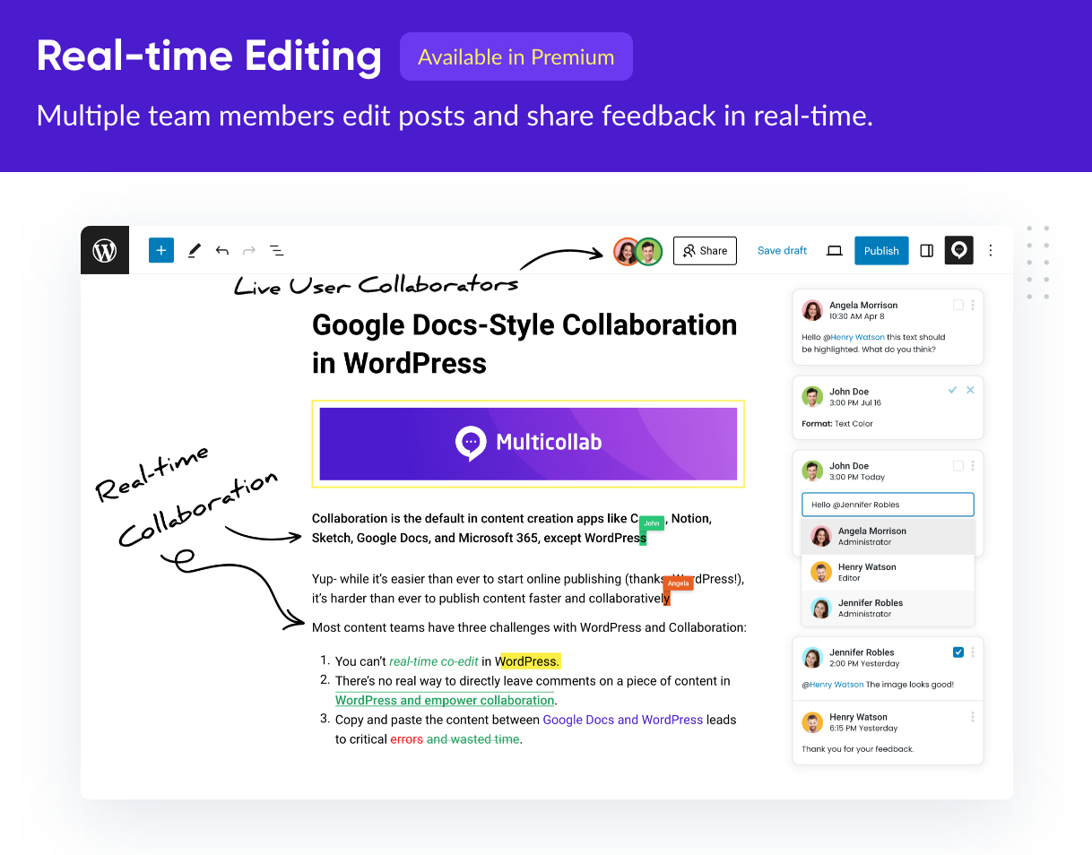 We bring to you – Multicollab: a WordPress collaboration plugin which lets you Comment, Suggest and Collaborate – in real-time, in WordPress without switching back and forth between WordPress and other Apps. You can easily share editorial feedback directly within WordPress, including commenting, tagging, replying and much more!