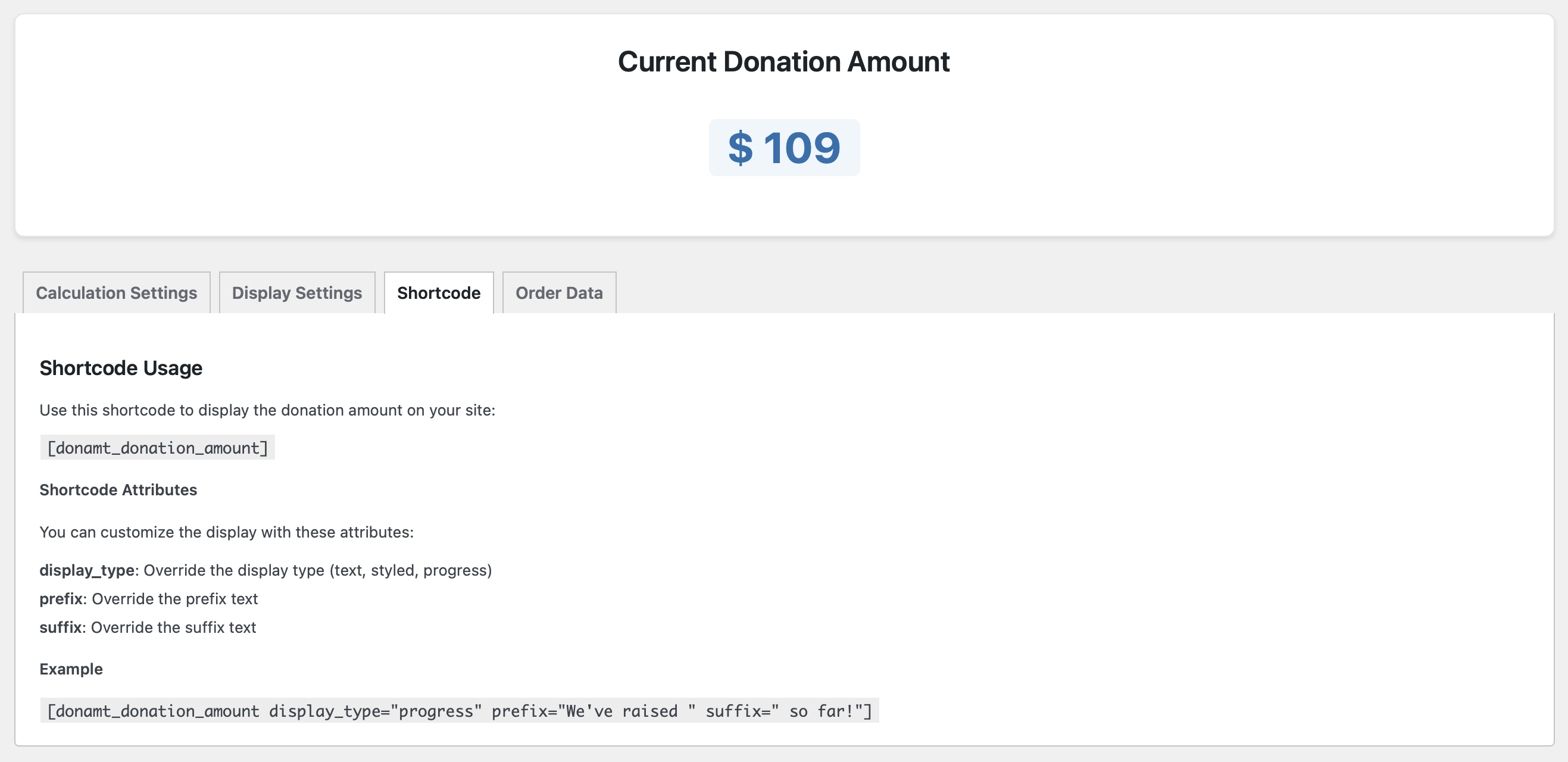 [donamt_donation_amount]shortcode to display the donation amount on any post, page, or widget.You can customize the display with attributes: